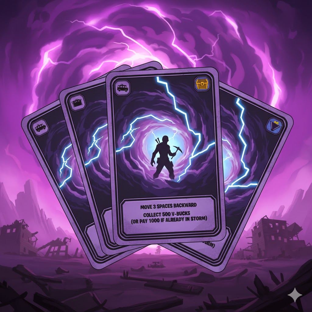Precis som i videospelet är stormen en ständigt närvarande fara i Fortnite Monopol. Stormen introduceras genom storm-kort som placeras ut på rutorna under spelets gång. När en ruta tas över av stormen, upphör dess normala funktion och alla som landar där eller passerar rutan förlorar HP. Ju längre spelet lider, desto fler rutor blir storm-rutor, vilket tvingar spelarna närmare varandra och ökar tempot drastiskt. Att hålla koll på vilka rutor som är säkra och vilka som är ”i stormen” är livsviktigt för att inte dräneras på HP i onödan under spelets slutskede.